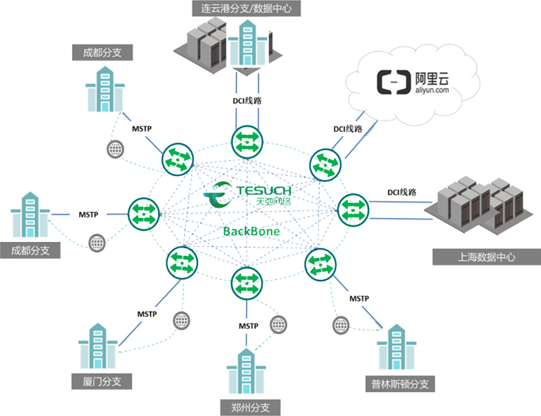 天弛在客戶(hù)端放置CE設備,客戶(hù)通過(guò)MSTP就近接入天弛骨干網(wǎng),實(shí)現CE設備與PE設備之間互聯(lián)互通,各個(gè)節點(diǎn)之間傳輸由天弛骨干網(wǎng)進(jìn)行傳輸,無(wú)需繞行總部/數據中心,降低時(shí)延,提高網(wǎng)絡(luò )可用率。