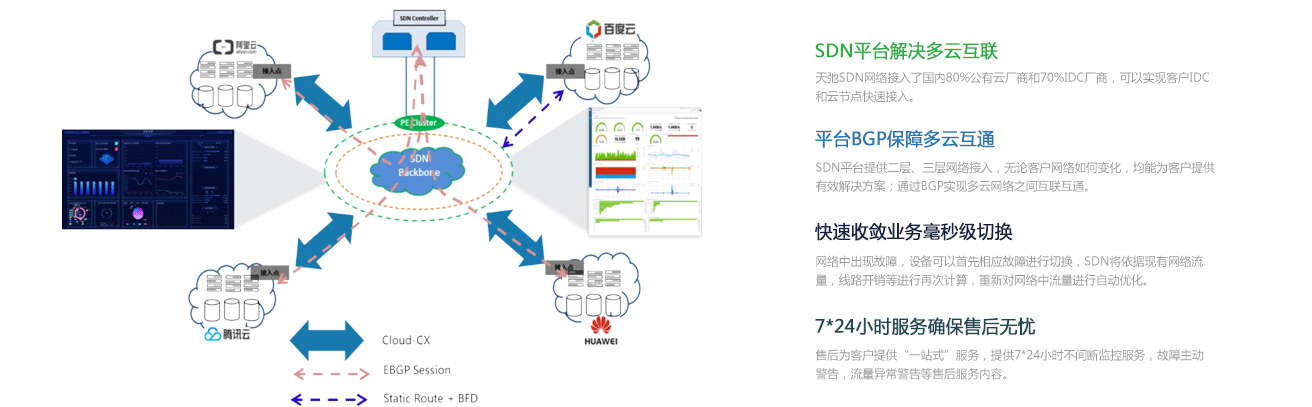 天弛SDN平臺與支持BGP公有云建立BGP,在不支持BGP公有云通過(guò)靜態(tài)路由進(jìn)行互聯(lián),將BGP發(fā)布至其他公有云,確保網(wǎng)絡(luò )結構不需要特殊調整