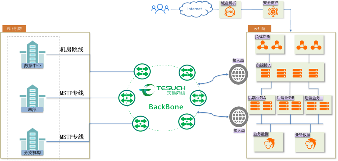 天弛SDN骨干網(wǎng)提供了一站式上云接入服務(wù),為客戶(hù)提供高效上云方案,客戶(hù)僅需要通過(guò)跳線(xiàn)即可完成上云線(xiàn)路;